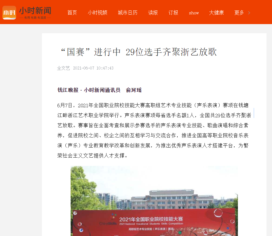 6月7日,2021年全国职业院校技能大赛高职组艺术专业技能(声乐表演)赛项在钱塘江畔浙江艺术职业学院举行。声乐表演赛项每省选手名额1人,全国共29位选手齐聚浙艺放歌。赛事旨在全面考查和展示参赛选手的声乐表演专业技能、歌曲演唱和综合素养,促进院校之间、校企之间的互相学习与交流合作,推进全国高等职业院校音乐表演(声乐)专业教育教学改革和创新发展,为推出优秀声乐表演人才搭建平台,为繁荣社会主义文艺提供人才支撑。