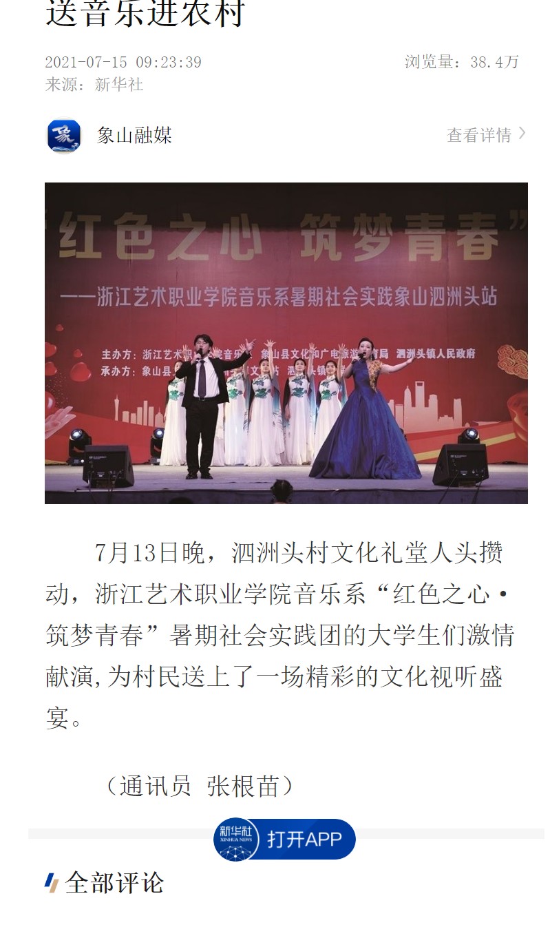7月13日晚,泗洲头村文化礼堂人头攒动,浙江艺术职业学院音乐系“红色之心·筑梦青春”暑期社会实践团的大学生们激情献演,为村民送上了一场精彩的文化视听盛宴。