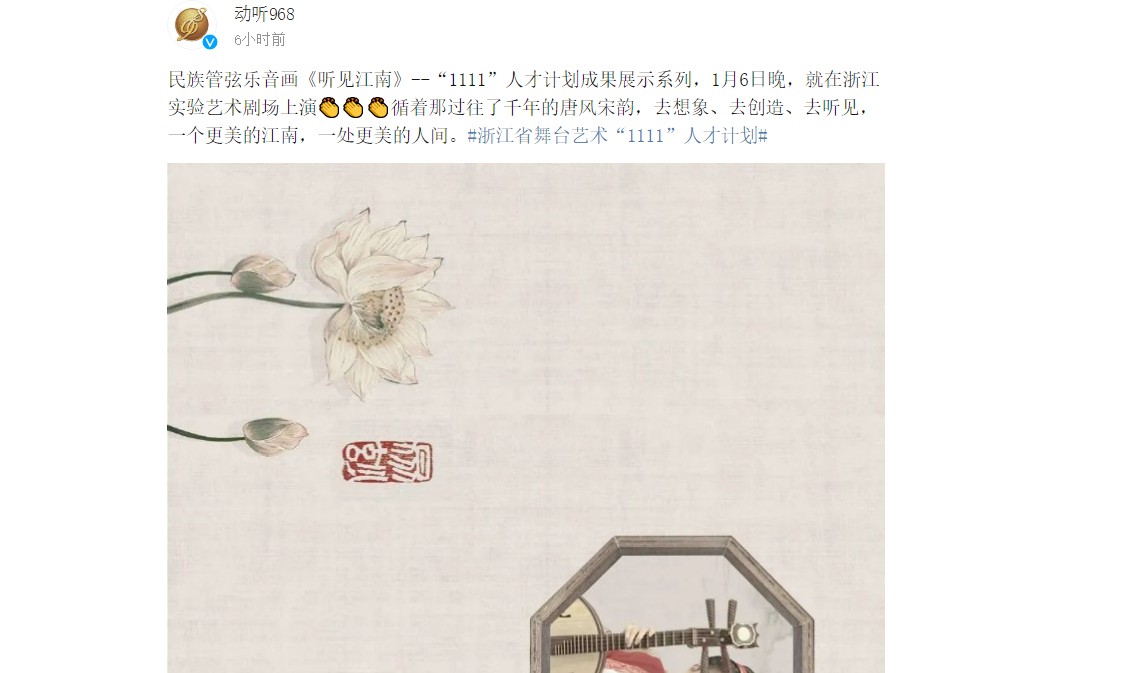 民族管弦乐音画《听见江南》--“1111”人才计划成果展示系列,1月6日晚,就在浙江实验艺术剧场上演👏👏👏循着那过往了千年的唐风宋韵,去想象、去创造、去听见,一个更美的江南,一处更美的人间。#浙江省舞台艺术“1111”人才计划#
