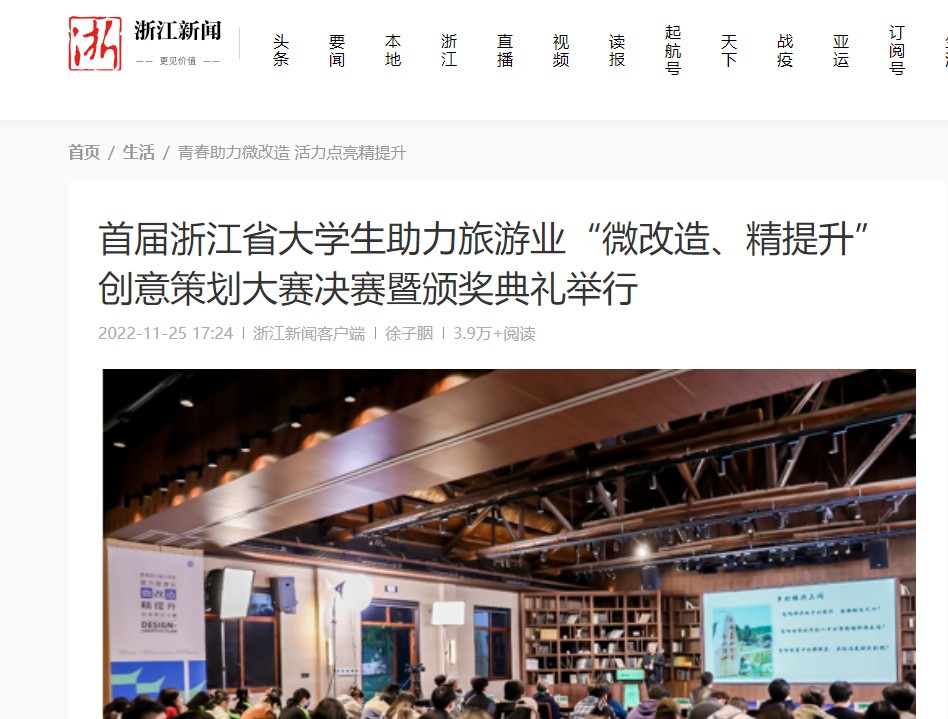微精点亮诗画江南,青春同绘共富蓝图。11月24日,由浙江省文化和旅游厅主办,浙江艺术职业学院、各市文化和旅游局承办,浙江乡村文旅融合研究中心执行承办的首届浙江省大学生助力旅游业“微改造、精提升”创意策划大赛决赛暨颁奖典礼在杭州市良渚国际研学中心举行。