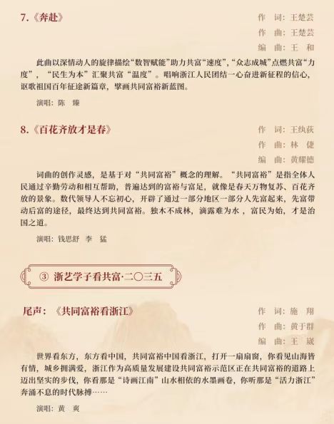 作为2021年度浙江文化艺术发展基金资助项目,这台音乐会以浙江推进共同富裕的实践过程为脉络,在全校范围内广泛征稿,组织音乐学院作曲理论教研室、声乐教研室、流行音乐教研室等部门创作了一批反映浙江人民推进共同富裕进程的优秀原创歌曲,以独唱、重唱、合唱等演唱形式展现浙江在高质量发展建设共同富裕示范区进程中涌现出的动人故事,唱响“共同富裕看浙江”的时代强音,学习贯彻党的二十大精神。