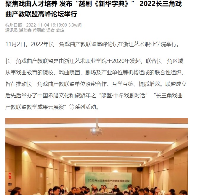 11月2日,2022年长三角戏曲产教联盟高峰论坛在浙江艺术职业学院举行。