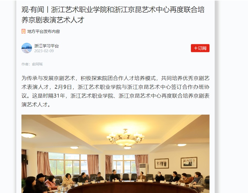 为传承与发展京剧艺术,积极探索院团合作人才培养模式,共同培养优秀京剧艺术表演人才,2月9日,浙江艺术职业学院与浙江京昆艺术中心签订合作办班协议。这是时隔31年,浙江艺术职业学院、浙江京昆艺术中心再度联合培养京剧表演艺术人才。