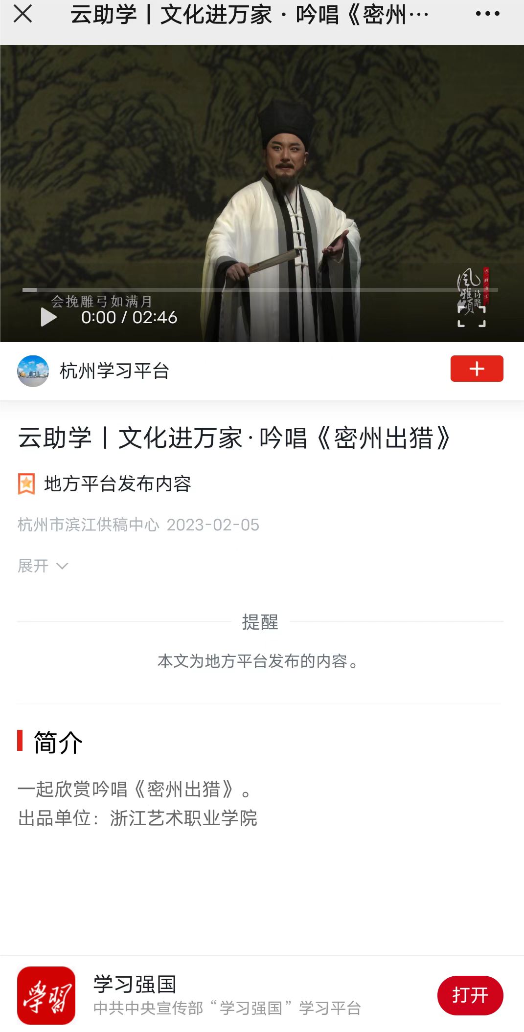 学习强国杭州平台:云助学丨文化进万家·吟唱《密州出猎》