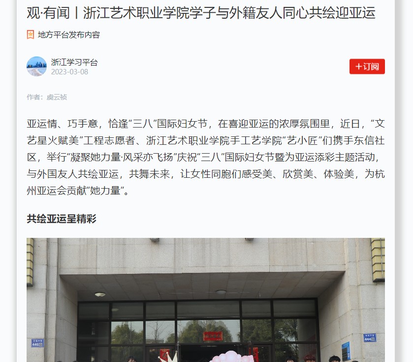 学习强国浙江平台:观·有闻丨浙江艺术职业学院学子与外籍友人同心共绘迎亚运