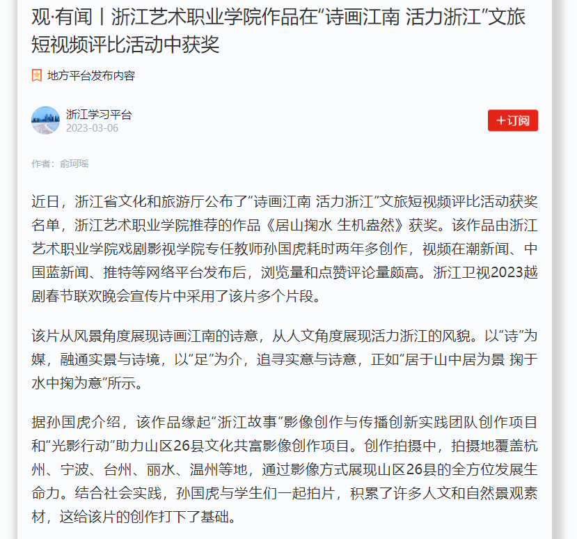 近日,浙江省文化和旅游厅公布了“诗画江南 活力浙江”文旅短视频评比活动获奖名单,浙江艺术职业学院推荐的作品《居山掬水 生机盎然》获奖。该作品由浙江艺术职业学院戏剧影视学院专任教师孙国虎耗时两年多创作,视频在潮新闻、中国蓝新闻、推特等网络平台发布后,浏览量和点赞评论量颇高。浙江卫视2023越剧春节联欢晚会宣传片中采用了该片多个片段。
