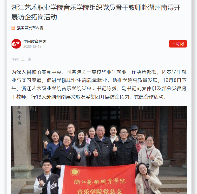 中国教育在线强国号:浙江艺术职业学院音乐学院组织党员骨干教师赴湖州南浔开展访企拓岗活动