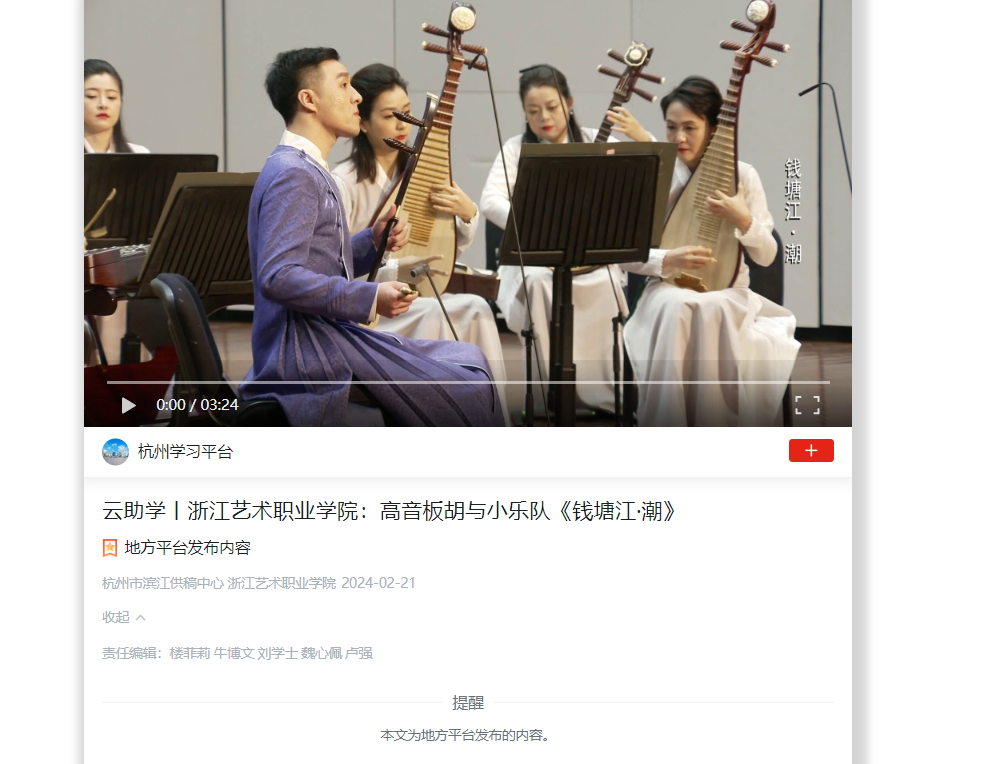 学习强国杭州平台:云助学丨浙江艺术职业学院:高音板胡与小乐队《钱塘江·潮》