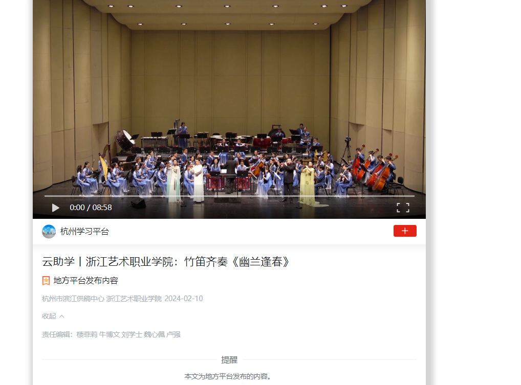 学习强国杭州平台:云助学丨浙江艺术职业学院:竹笛齐奏《幽兰逢春》