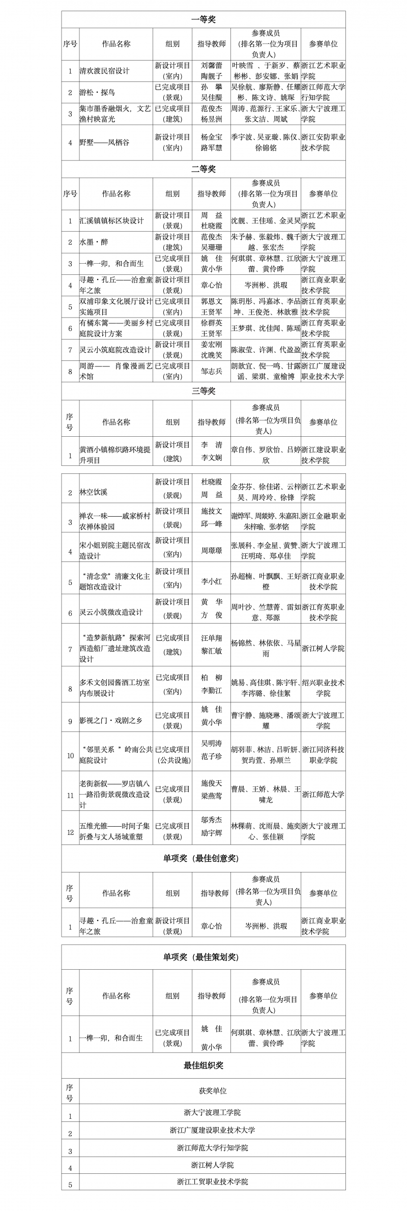 本次大赛吸收最具活力的大学生群体的创意创新,以大学生为项目负责人,由学生担任组织者、引导者、合作者,成为设计项目的主人翁,充分发挥大学生的主观能动性,努力形成“微改造、精提升”设计标志性成果,指导A级旅游景区、度假区等微改造实践,助力实现“席地而坐、悦心而游”。自去年5月大赛启动以来,受到省内高校的广泛关注和踊跃参与,共有34所高校、121个师生团队、586名师生参赛。经过角逐,大赛最终产生一等奖4个、二等奖8个、三等奖12个、优秀奖16个,以及最佳创意奖1个、最佳策划奖1个、最佳组织奖5个(获奖名单见附表)。