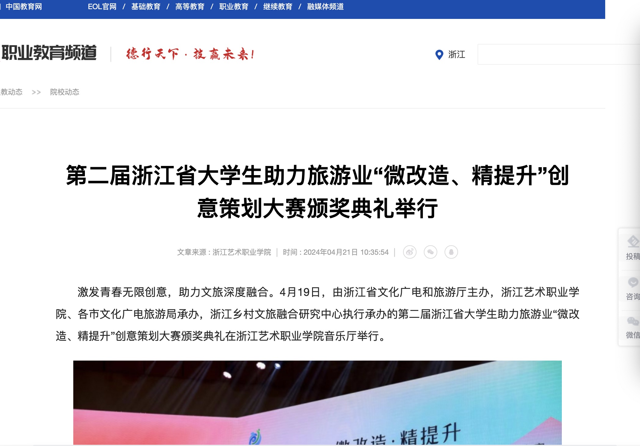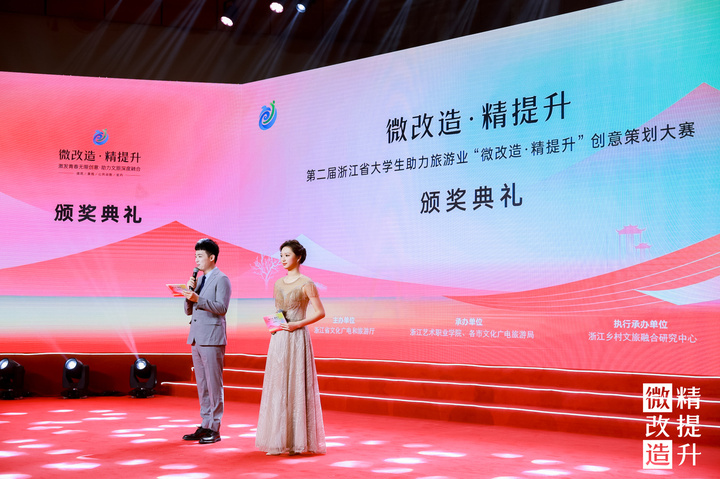 激发青春无限创意,助力文旅深度融合。4月19日,由浙江省文化广电和旅游厅主办,浙江艺术职业学院、各市文化广电旅游局承办,浙江乡村文旅融合研究中心执行承办的第二届浙江省大学生助力旅游业“微改造、精提升”创意策划大赛颁奖典礼在浙江艺术职业学院音乐厅举行。