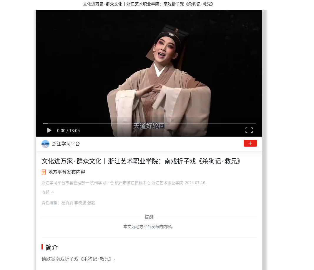 学习强国浙江平台:文化进万家·群众文化丨浙江艺术职业学院:南戏折子戏《杀狗记·救兄》