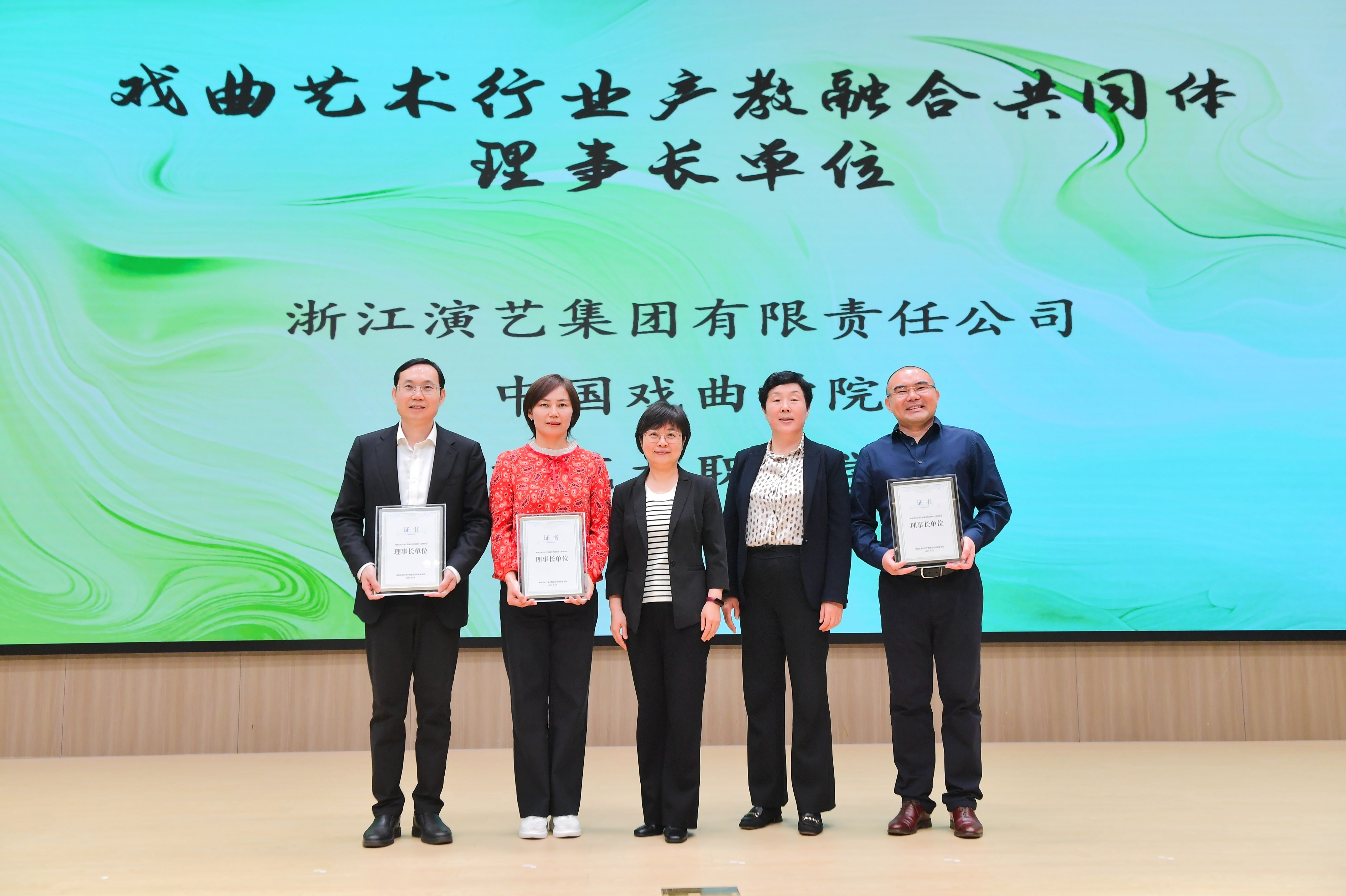 在热烈的掌声中,与会领导嘉宾共同上台,完成了戏曲艺术行业产教融合共同体的成立仪式,并为首届理事长单位、副理事长单位授牌。