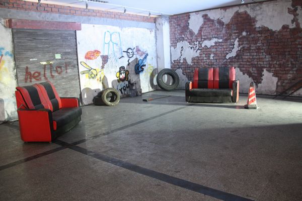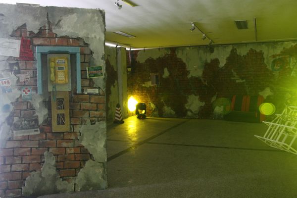 这次毕业展览依托4号楼大厅为空间,创造出一个复古中透着七八十年代叛逆朋克气息的世界。离四号楼正门50米开外的地方,老远就能望见一个火红的立方体,上面刻有四个黑色木雕大字——舞美出品。展区入口呈凹形,犹如哆啦A梦的时光隧道,带你进入一个现实穿越梦幻的舞台。这不是好莱坞大片现场,也不是街舞社团,更不是3D鬼屋,但这里的每一个细节无不体现出奇幻与现实的巧妙结合。场景内部设有3个彩色散光灯,颜色依次是:红、蓝、黄、橙、紫、白。红色给人一种火焰燃烧之感,绿色则透着一种温暖奇幻之感,而白色又带来回归现实的感觉。墙上布满了涂鸦,还有左测废弃的轮胎,旧沙发,可口可乐的汽油桶。楼梯和门的设计也成为展出的一道风景线,往右边走去你会看见一个类似于观望台一样的梯子,当灯光匀速转动并更换时,会在墙上形成不同的投影。