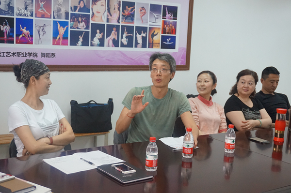 除了教学之外,舞蹈系还安排王童与教师们进行面对面交流座谈,共同探讨教学过程中遇到的问题,现场气氛热烈。王童结合自身的经历,告诉老师们:在训练过程中应该让学生明确训练的目的是什么,要注重启发和教学方式;给予学生训练的组合不需花俏,但必须有明确目的性。另外,,他还就“主力腿”和“动力腿”的力量问题与老师们进行了探讨。舞蹈系主任张星认为,对舞蹈教学共性的知识应相互学习、加强研究,才能不断提高教学水平。