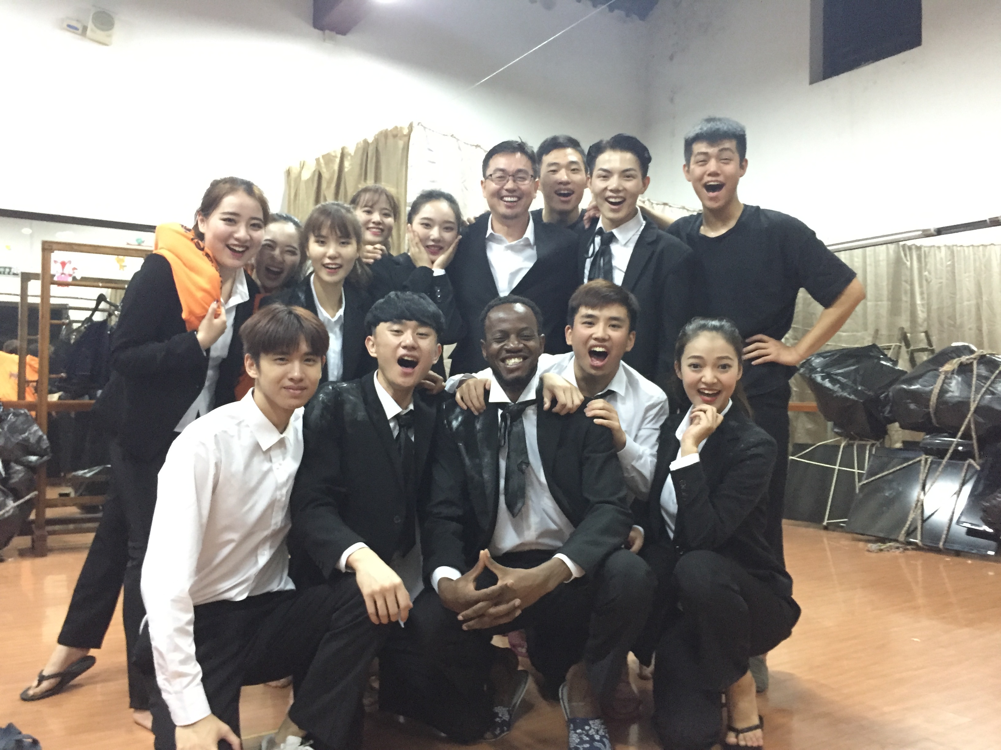 日月广场舞台演出地点在日月广场,由于第二天就是首演,于是在到达乌镇的当天下午,师生们便投入了紧张的排练。为了将自己最好的一面呈现给观众,大家保持了高昂的热情,使得联排一遍比一遍出色。演出前,所有演员就位,一起握手,共同加油。从走上台的那一刻起,同学们尽情享受着舞台,并以出色表现获得了剧目组的好评和观众的热烈掌声,同学们觉得,此前所有的辛苦和努力都是值得的。首演成功,令同学们倍感激动和喜悦。回到休息室后,首演庆功宴早已布置好。更让同学们振奋的是,赖声川导演也特地赶来,跟剧组成员一起合影、举杯,同贺首演成功。赖声川导演对首演成功表示祝贺,《李尔王》的导演窦辉向赖导介绍了剧组所有成员,对浙江艺术职业学院表演艺术专业加盟这次演出表示感谢,对同学们在排练中的敬业态度和在舞台上的出色表现表示赞赏。
