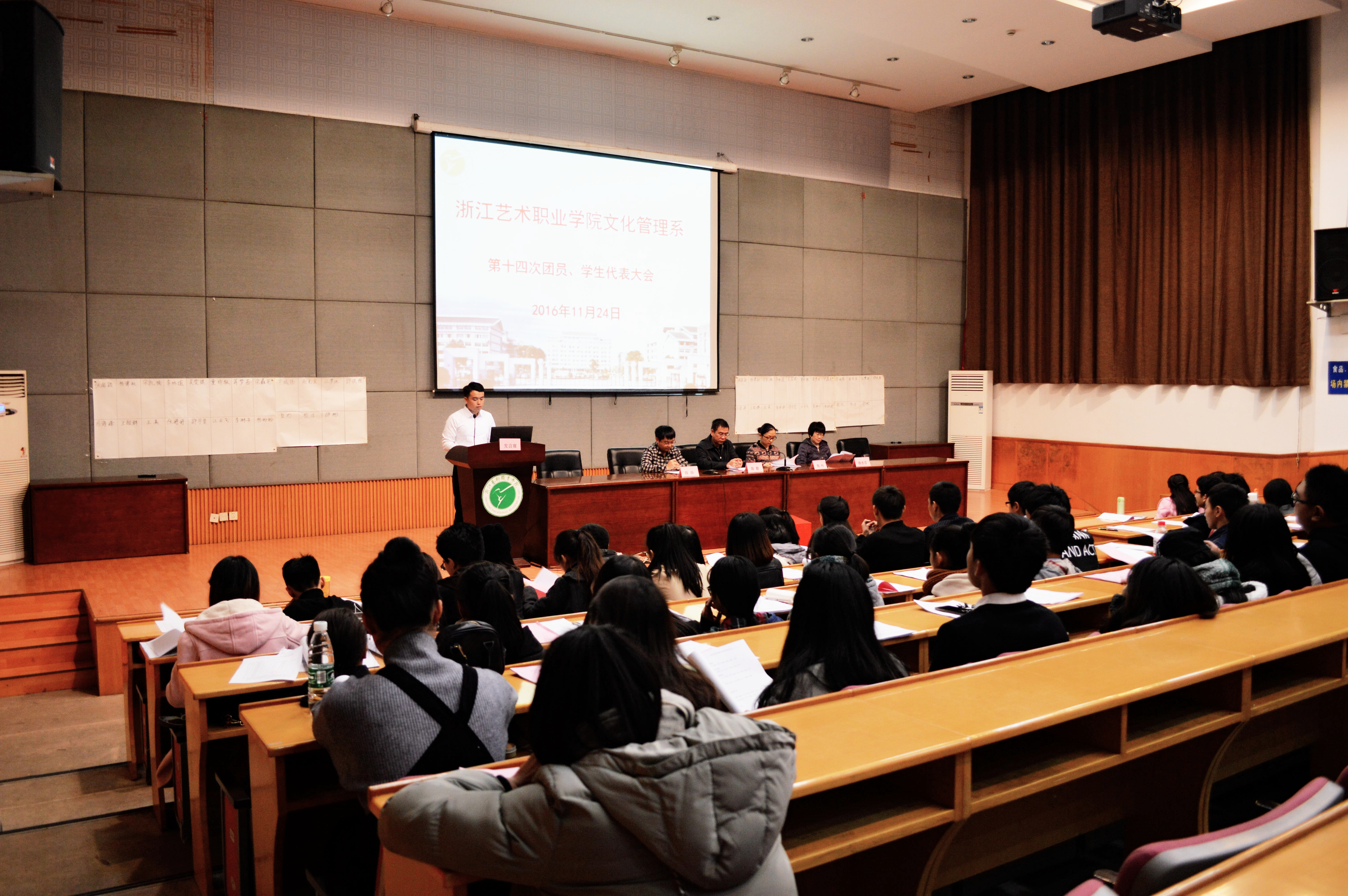 11月24日晚,浙江艺术职业学院文化管理系第十四次团员、学生代表大会在图信中心报告厅举行。院党委学工部副部长、学生处副处长(主持工作)陈毅、院团委副书记郑吟及文管系师生代表等出席本次会议。