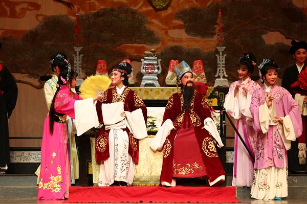 在戏的开头,舞台大幕一拉开,花团锦簇的小生、花旦就在“喜满华堂寿烛红”的喜庆中登台。台上人物个性鲜明,如大女婿、二女婿,一个学而无德,一个富而无品,学生表演得很是生动,现场剧团的老师们夸赞说:真是后生可畏。