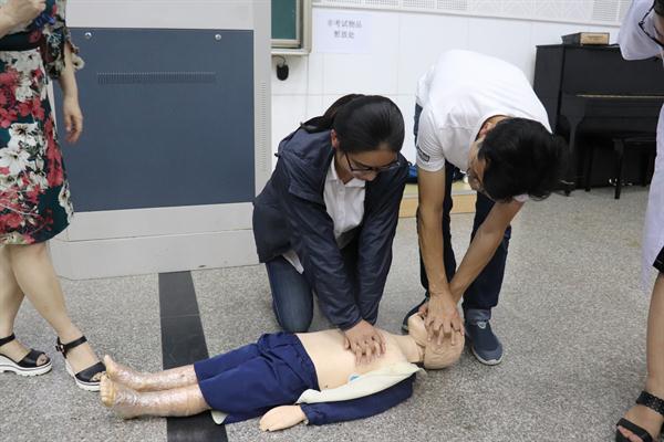 陈超以发生在校园内的一个个真实案例为切入点,介绍了遇到咽部受伤、咬(蛰)伤、惊厥,中暑、烧烫伤等突发情况时的急救方式,重点介绍了如何有效实施“心肺复苏”。陈超说,心搏骤停一旦发生,若得不到及时抢救复苏,4到6分钟后便会造成患者大脑和其他重要器官组织的不可逆损害,因而,心搏骤停后的心肺复苏必须在现场立即进行。现场,三位杭州儿童医院急诊科护士详细讲解并示范了心肺复苏的方法,同学们踊跃上场尝试,三位护士手把手地进行指导,矫正他们的错误姿势。