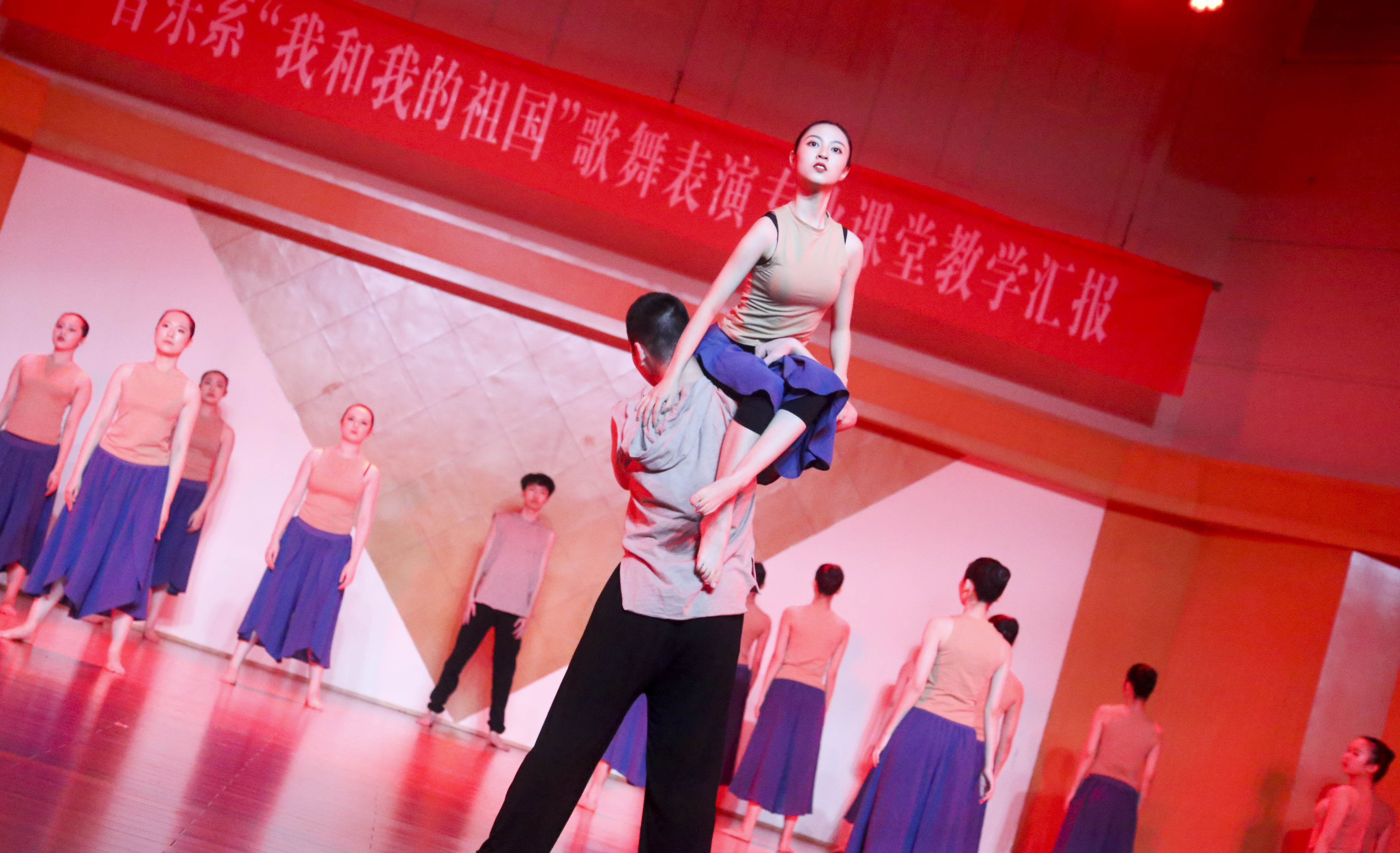 歌舞庆盛世,献礼70年。为献礼新中国成立70周年,颂扬心系祖国的爱国情怀,弘扬和传承中华民族文化,丰富校园文化生活,展现音乐系歌舞表演专业教育教学成果,4月15日,以“我和我的祖国”为主题的歌舞表演专业课堂教学汇报在学校音乐厅上演。校党委书记朱海闵莅临汇报演出现场,音乐系16歌舞一贯班、17歌舞大专班全体学生担当主演,音乐系师生代表两百余人观看演出。