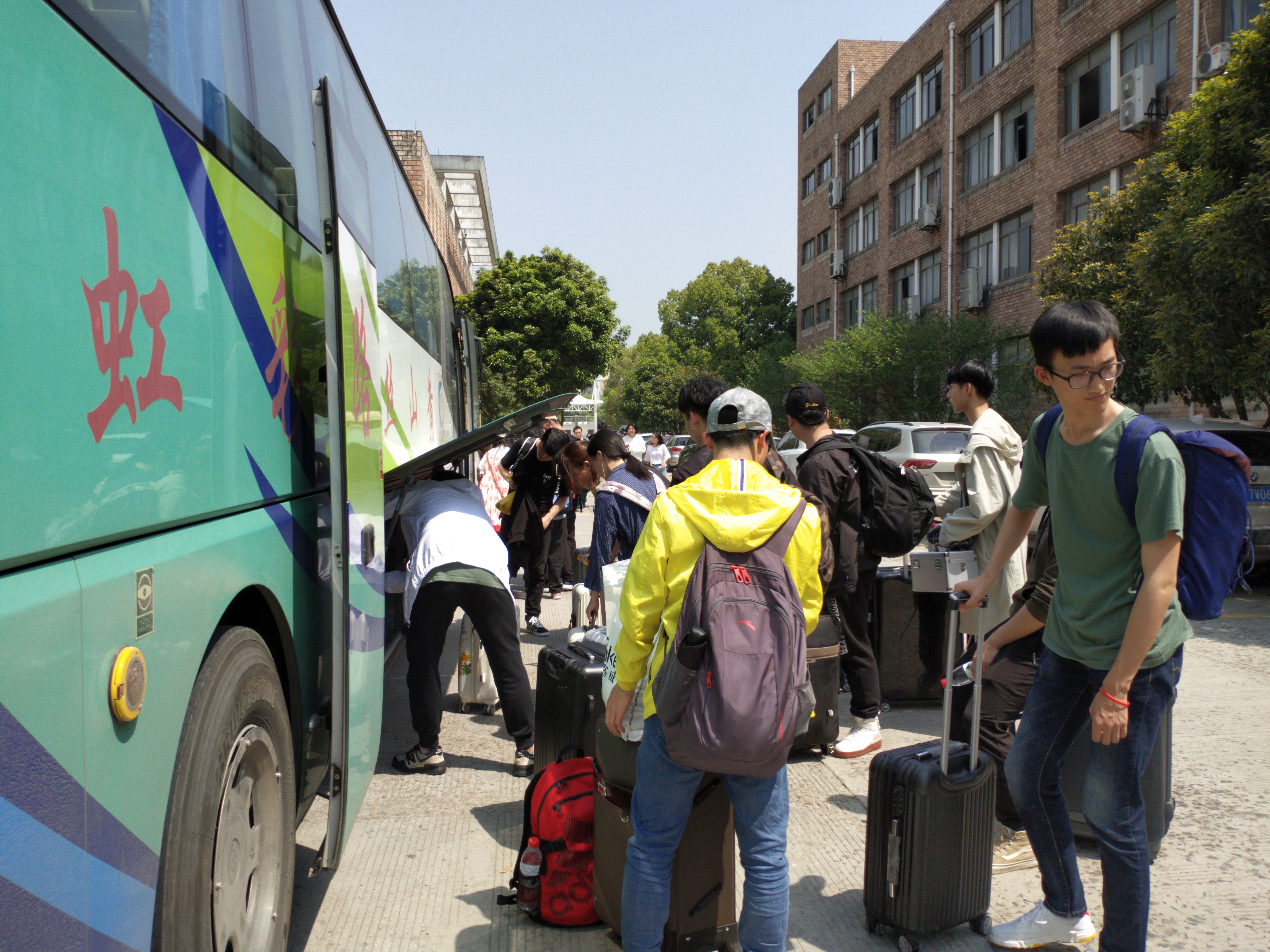 4月8号下午一点半,由美术系副主任(主持工作)、党总支副书记刘发奎带队,18舞台艺术设计与制作、18动漫设计与制作、18动漫设计3+2、18环境艺术设计共154名同学及9位教师(第一批)共赴安徽歙县渔梁坝写生基地。 一点左右,已经有不少同学在八号楼前等待。因为天气炎热,树荫处聚集了很多同学,他们说笑着,带着些许期待。在等待的过程中大巴车缓缓驶来,虽然头顶大太阳,同学们也不急不乱,有序地摆放行李上车就座。