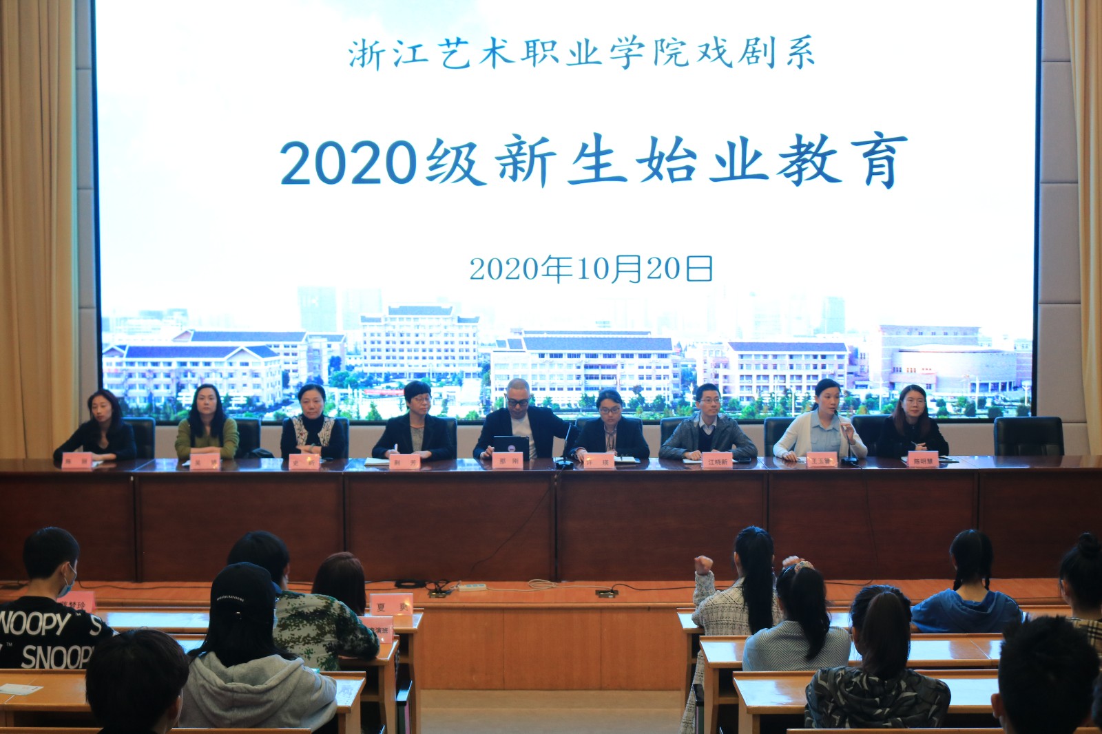 10月20日,戏剧系2020级高职新生始业教育在图信报告厅举行。戏剧系副主任(主持工作)那刚、党总支专职副书记许瑛、副主任荆芳、各教研室主任、组织员、辅导员、班主任参加。