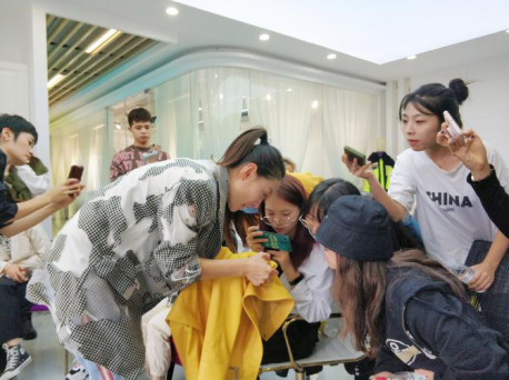在赢嘉设计有限公司总部的课堂上,企业导师任敏介绍了一线时装行业的设计工作流程、皮革市场消费趋势与零售概况,并给同学们讲解了具体皮革皮草服装工艺、面料、细节等专业知识。