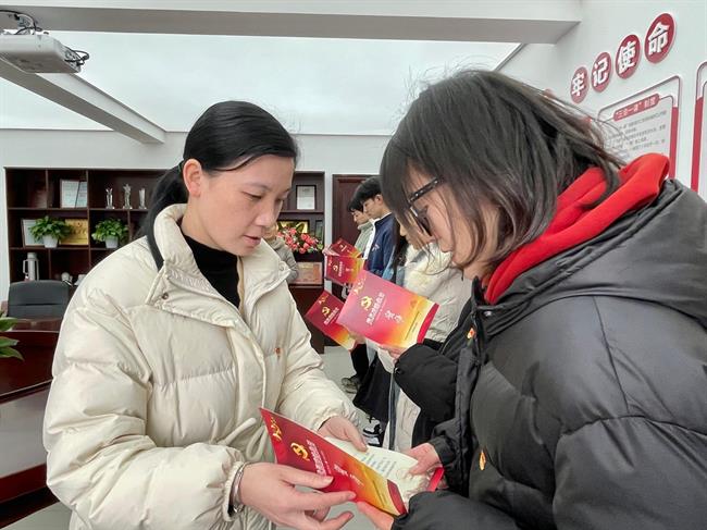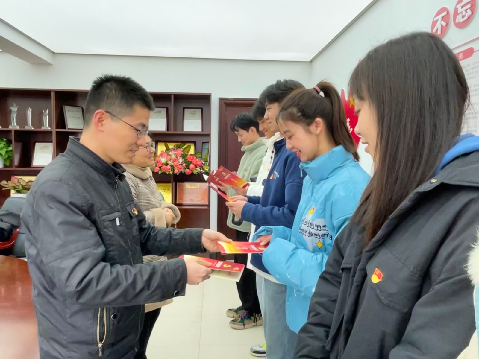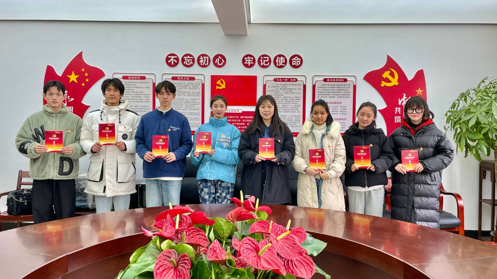 江晓新同学们加入党组织表示祝贺,希望新党员不但要在组织上入党,更要在思想上入党,要永远保持入党的初心,把入党作为人生、事业的新起点全体党员同志支部书记王玉簪的带领下进行集体宣誓,面向党旗,举起右手,掷地有声地宣读“我志愿加入中国共产党,拥护党的纲领,遵守党的章程,履行党员义务......”每名党员都发自内心的声音宣告了自己对党忠诚的决心。