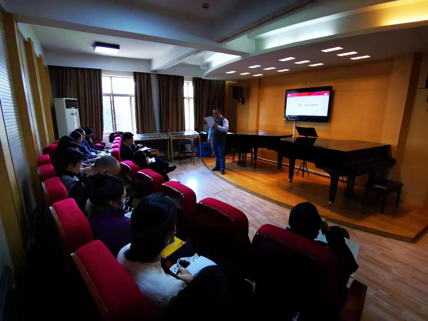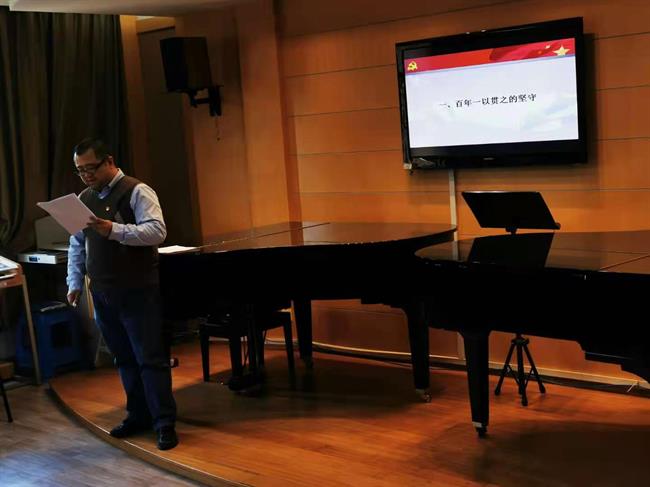 音乐系教工第二党支部在系双钢琴教室开展主题党日活动。系副主任潘骅以《中国共产党的百年坚守》为题讲党课。他以百年一以贯之的坚守、百年一往情深的坚守、百年一往无前的坚守为主线,向全体党员强调要坚定信仰不动摇、毕生践行不放松、终身奋斗不懈怠,要做到牢记党的恩情、国家的深情、人民的感情、工作的激情,要心忠、要行正、要做实,积极发挥党员的先进模范作用,在工作中做到学党史、悟思想、办实事、开新局,为学校和音乐系的建设添砖加瓦!