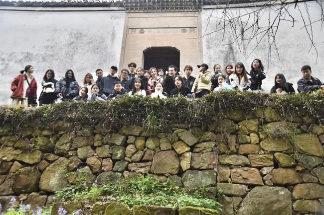 演出结束后,同学们唱着军歌马不停蹄地前往新四军后方医院疗养所旧址采风。这里地处苏浙皖三省交界,四周崇山峻岭、竹深树茂,地势险要。抗战时期,新四军后方医院条件十分艰苦,许多伤员因伤势过重而长眠于山顶,新四军战士始终保持坚定的革命信仰,如钢铁般的意志,无惧无畏的革命乐观主义精神,深深感动着所有人。在旧址旁的左侧外墙上至今还保留着浙江省政工队队员书写的抗战标语:“老百姓会打仗,才能保住家乡。”