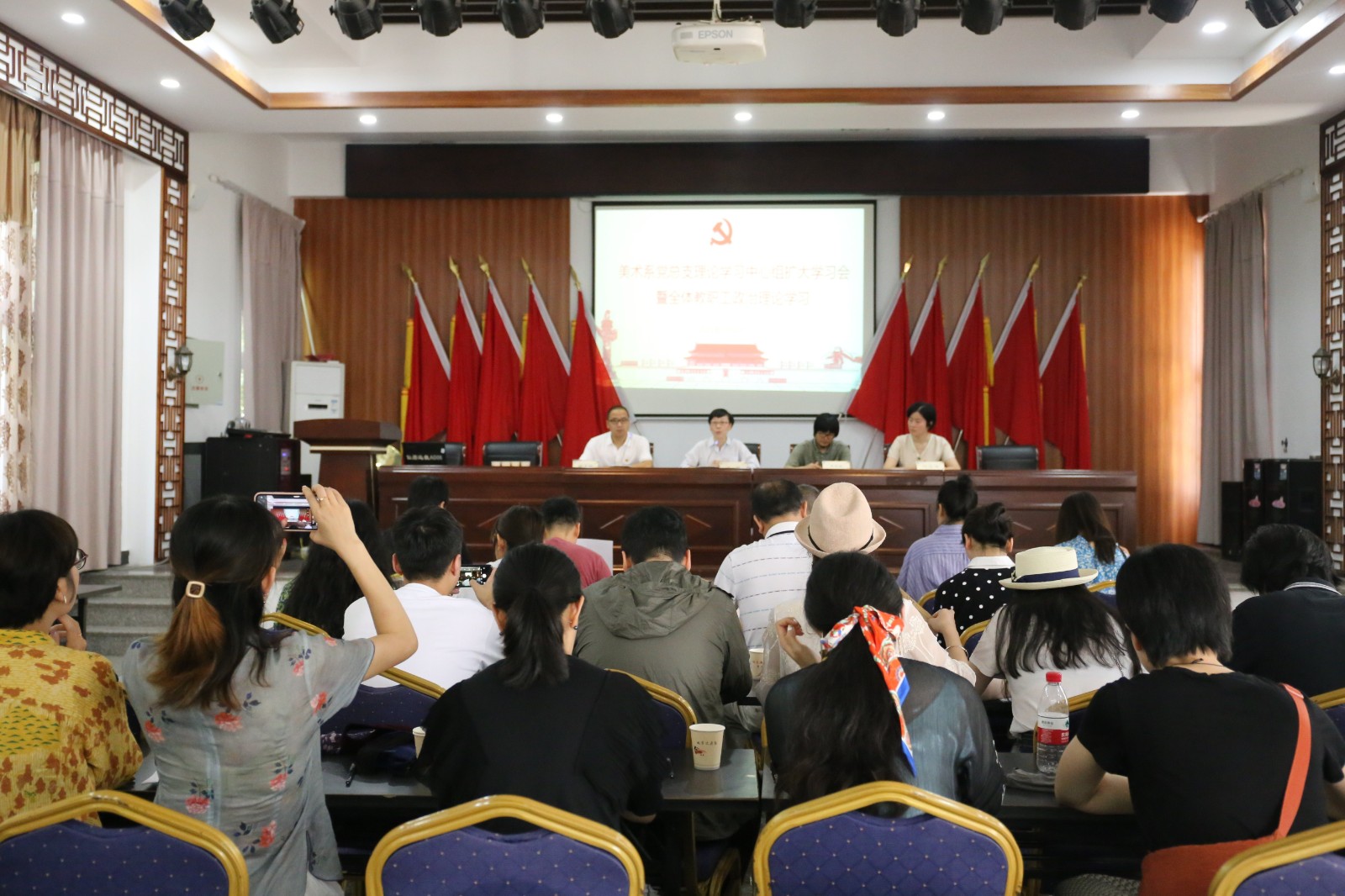 7月12日上午,美术系党总支理论学习中心组扩大学习会暨全系教职工政治理论学习会在中共仙居县委旧址纪念馆会议室举行,美术系党政班子、支部书记、组织员、教研室主任及全体教职工参加学习。美术系党总支专职副书记顾才铭主持学习会。