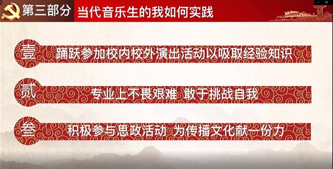 为庆祝中国共产党成立100周年,强化师生爱党、爱国、爱社会主义的坚定信念,引导青年树立远大理想、铭记历史,音乐系从4月开始,结合“礼赞建党百年 奏响奋进旋律”庆祝中国共产党成立100周年系列活动方案,先后组织开展了“建党百年故事汇”主题班会、微宣讲比赛、演讲比赛、征文比赛、读书故事分享等系列活动,帮助全系师生始终牢记宗旨意识,持续锤炼党性修养,在奋斗中坚守初心,在传承中勇担使命,持续为推进学校和音乐系高质量发展贡献力量。