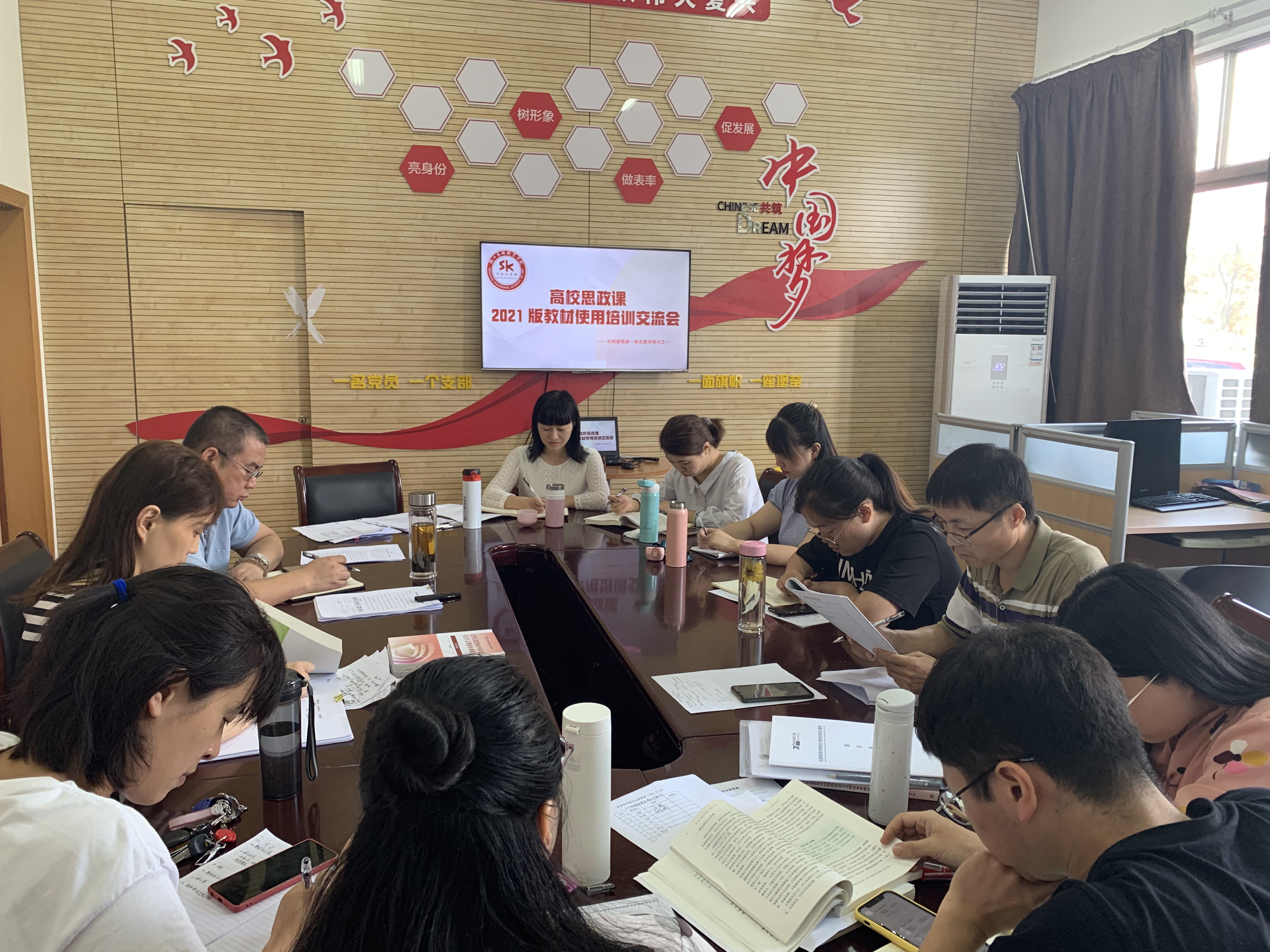 学期,新气象。由中宣部、教育部组织修订的高校思政课2021年版新教材也伴随着2021届新生如约而至。针对中宣部理论局联合教育部教材局和高等教育出版社组织开展的高校思政课2021年版教材使用培训,社会科学部高度重视,要求全体思政课专兼职教师在合理规划各项工作安排的同时,认真完成9月27日-29日三天的直播学习。为了巩固学习效果,交流学习体会,激发创新思维,9月30日,社科部在13102室召开了高校思政课2021版教材使用培训交流会。会议由社会科学部副主任胡卓群主持。