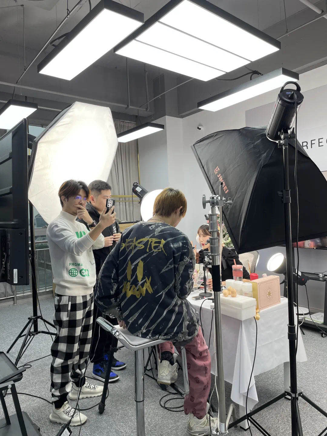 黄旭带领同学们参观了公司内colorkey和完美日记的直播间,详细介绍了直播间的器材、灯具等软硬件设施,向学弟学妹们示范了直播话术,介绍了中控、场控、助播等岗位的职责和任务。同学们对直播间十分好奇,跃跃欲试,纷纷站上了主播台和中控室,体验了各个环节的工作流程。
