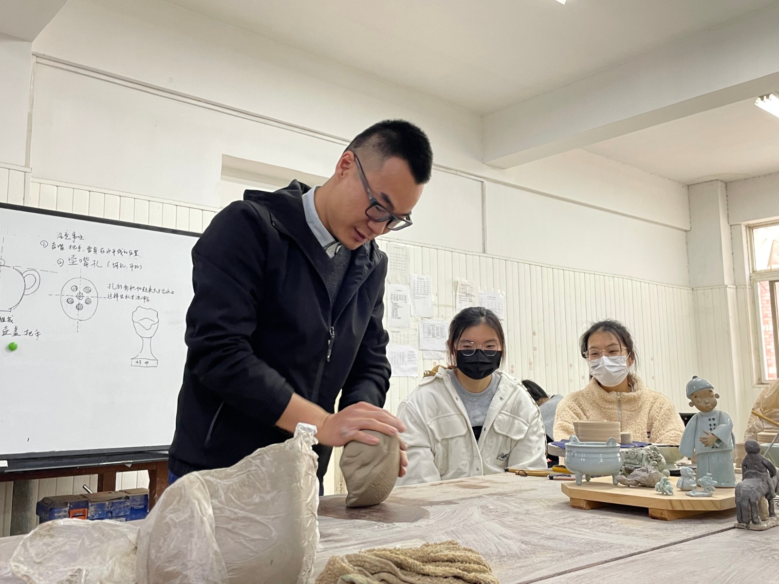 手工艺学院教师郑源雷为同学们讲授基础泥塑知识,他表示,泥塑在人类发展的历史上,一直伴随着生活不断传承,已经成为中华民族民间艺术的一种,并且走出国门,成为中外文化交流的使者;泥塑作品与音乐作品也有其共通之处,比如状态的相通,对形象的理解与把握等;通过今天的泥塑艺术作品创作,最重要的是学会感受,在实践中感受两个艺术形象之间的共通之处,为学好唱腔设计课提供一些新的思考