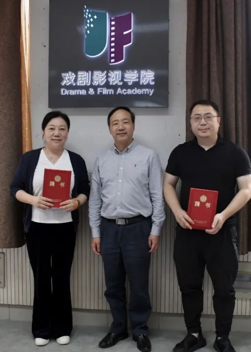 夏开堂与彭云波共同为戏剧影视学院“两系一中心”揭牌,为两位系主任颁发聘书。