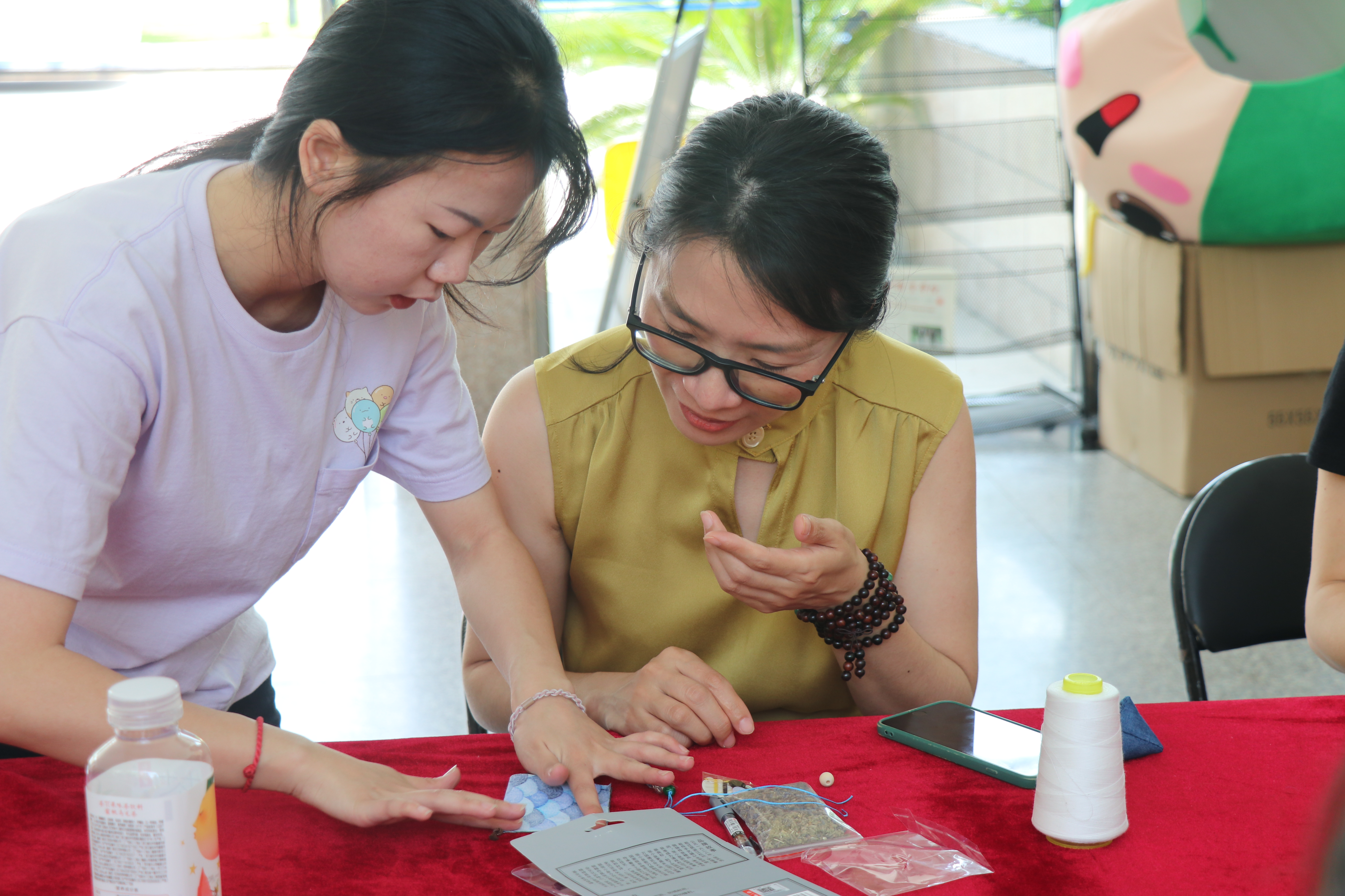 在制作香包之前,艺小匠志愿者详细讲解了制作香包的步骤和注意事项。介绍完之后,由艺小匠志愿者们带领老师和同学们制作香包。
