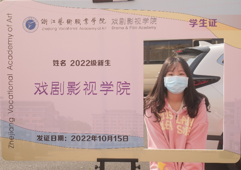 新生们手持各式KT板在背景板前打卡留念,在背景板上寻找自己的面孔,在“学生证”前留下入校的第一张照片。