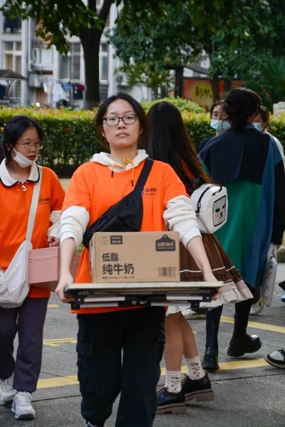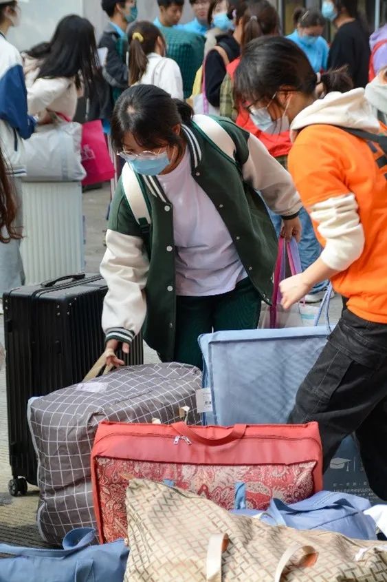 热情的学生党员和志愿者们身穿七彩T恤,积极接待新同学,答疑解惑、指引道路、搬运行李,帮助新生顺利完成各项报到手续。