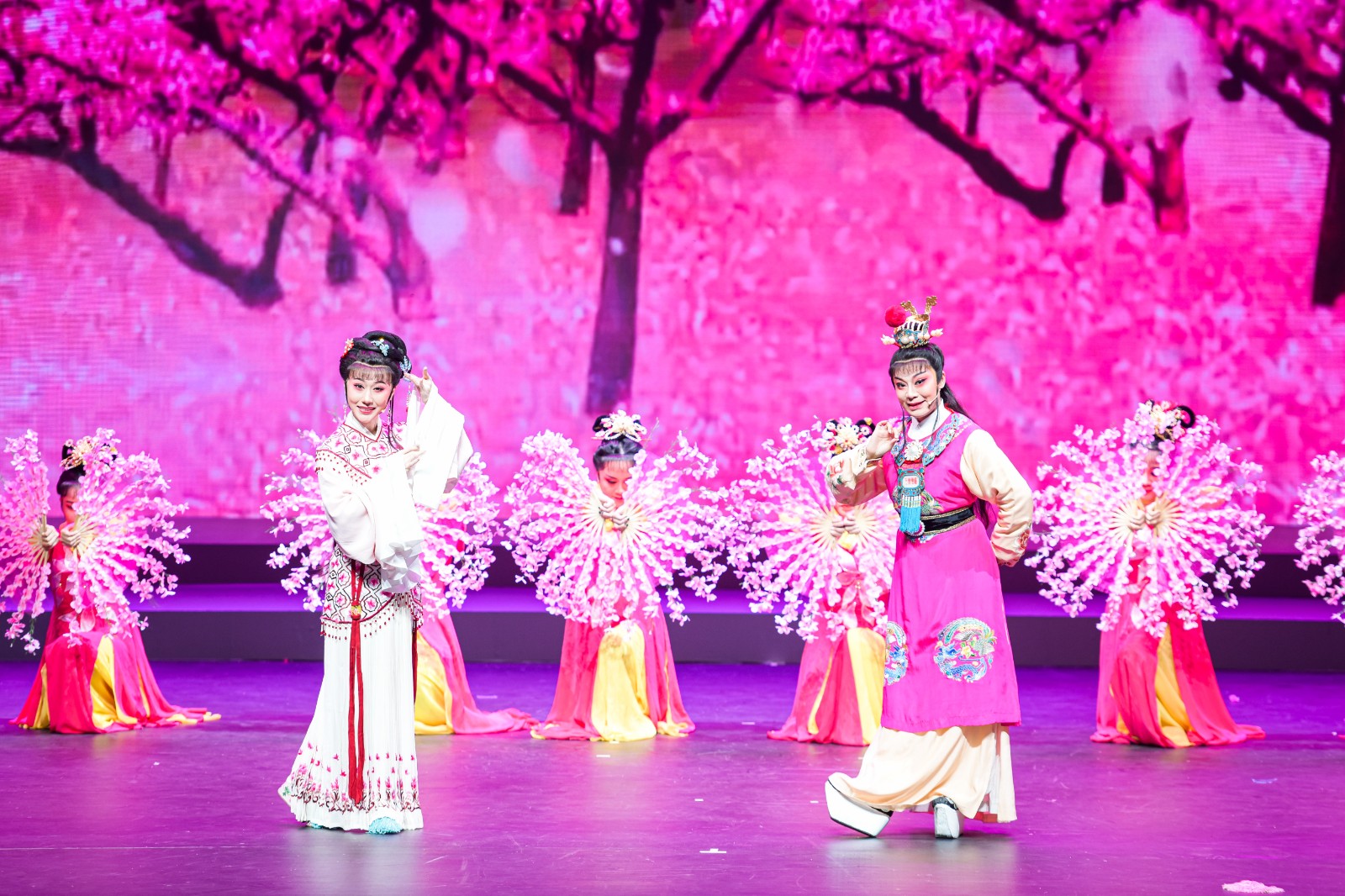 来自浙江各地20余家民营文艺表演团体倾情演出《梁祝·十八相送》《大山的儿子》《水漫金山》《活捉三郎》等16个折子戏和1首戏歌。此次参加演出的剧团是由各市文化和旅游局推荐选送,经专家评选,围绕演出要求遴选出部分剧团和剧目。演出由序《盛世梨园曲》、第一篇章《越韵华章》、第二篇章《时代馨香》、第三篇章《百花芬芳》及尾声《永远跟党走》五个篇章组成,内容丰富多彩,越剧、婺剧、瓯剧、台州乱弹、皮影戏等8个剧种亮相展演,既有传统戏又有现代戏。演员们个个精神饱满、韵味十足,唱、念、做、打有模有样,一招一式、一腔一调,都极具专业水准,展示了戏曲艺术绚丽多姿、流光溢彩之美。演员们用高度的专注和全情的投入,呈现出了一场独具特色的文化盛宴。
