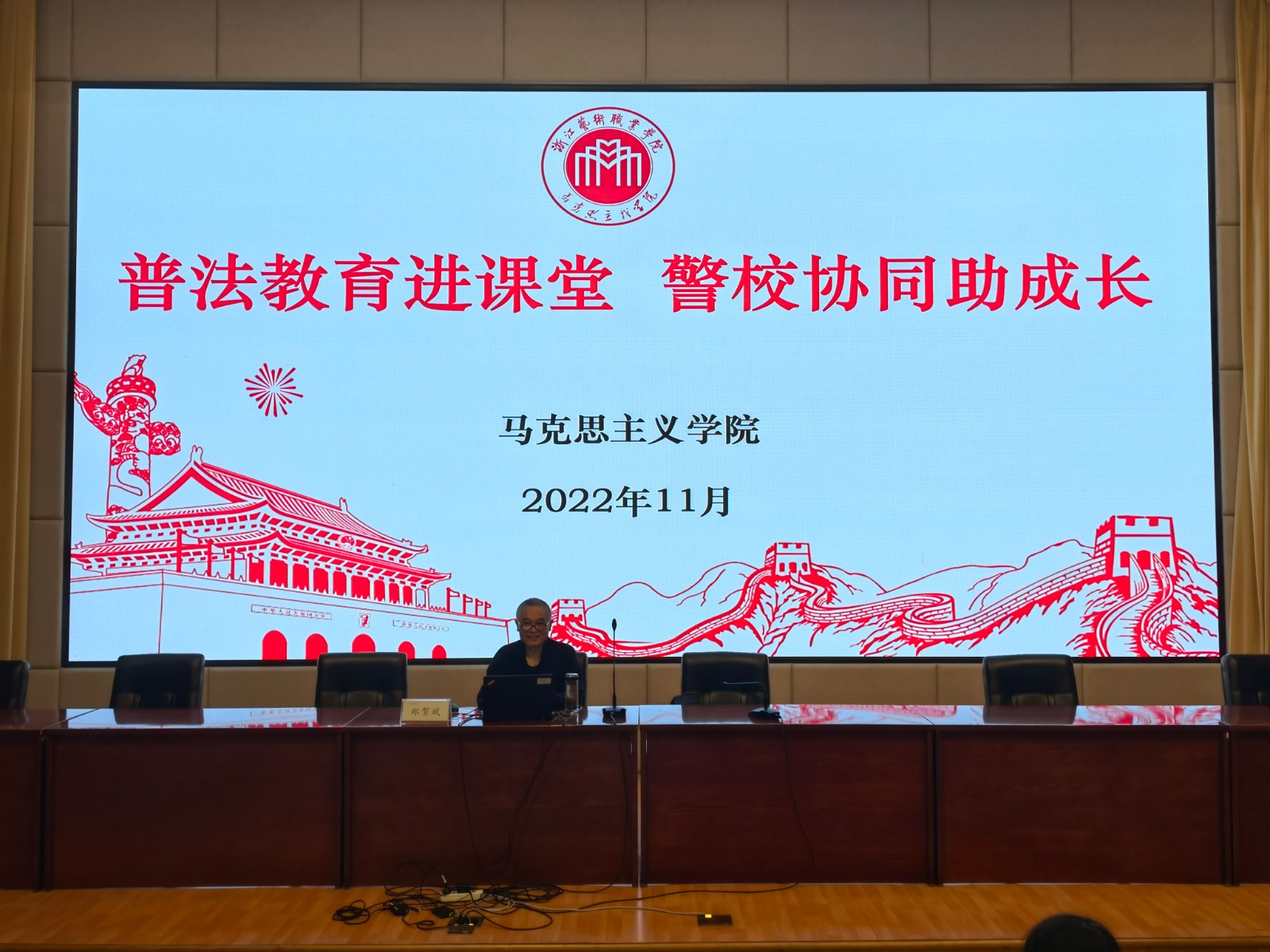 习近平总书记高度重视青少年法治教育,明确提出“普法工作要在针对性和实效性上下功夫,特别是要加强青少年法治教育”。为贯彻落实党的二十大精神,进一步做好校园法制宣传教育工作,提高中职学生的法治意识和自我保护意识,营造平安和谐的校园环境,11月15日上午,马克思主义学院综合教研室邀请浙江省未成年犯管教所民警郑贺斌为我校五年一贯制中职段一、二年级约300余名师生开展主题为“学法·立德”的普法知识讲座。