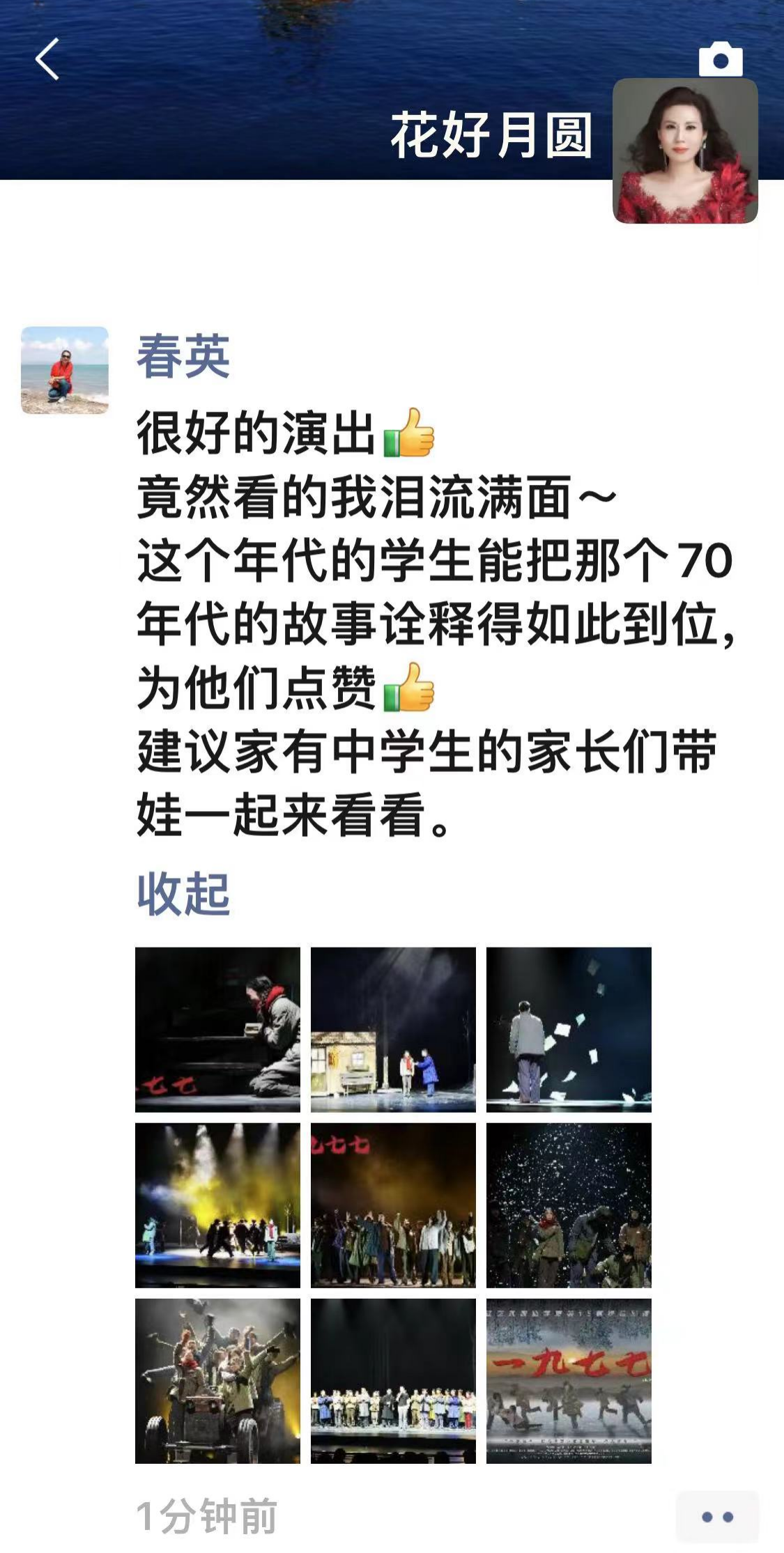 话剧《1977》在电影《高考1977》的基础上,加了一条知青后代返乡支教的“线”,两个时空平行叙述,使我多了一份对那段岁月的回望和感慨。剧中的知青岁月,是父母辈的青春。我现在越来越理解他们在我小时候,嘱咐我好好读书时的那份殷切。每个时代都会有相同的境遇,人作为个体,在势不可挡的政治、经济、军事、疫情这样的大环境中,始终是渺小的,但仍然可以选择坚强,正如话剧《1977》里的他们,无力反抗时积蓄力量,在机遇来临时豁出去拼搏一把,去改写自己的命运。