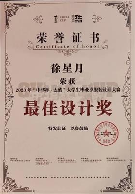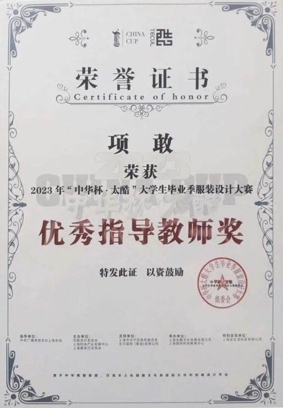 3月27日晚,由中国流行色协会、上海时尚产业发展中心、上海服装行业协会共同主办的“中华杯•太酷”大学生毕业季服装设计大赛决赛暨颁奖典礼在上海静安800秀举行。近千件大学生毕业设计作品,经过初评复评,于当晚角逐评出最终大奖。设计学院服装与服饰设计专业邱佳琪和徐星月的《一卯异樣》作品在全国3000多份作品的选拔中脱颖而出,入围大赛总决赛并荣获主赛道“最佳设计奖”,项敢获优秀指导教师奖。作品在复评阶段即参加了AW23上海时装周MODE商贸订货会,通过订货交易场景直面各地买手,获得商业尝试和实验机会。