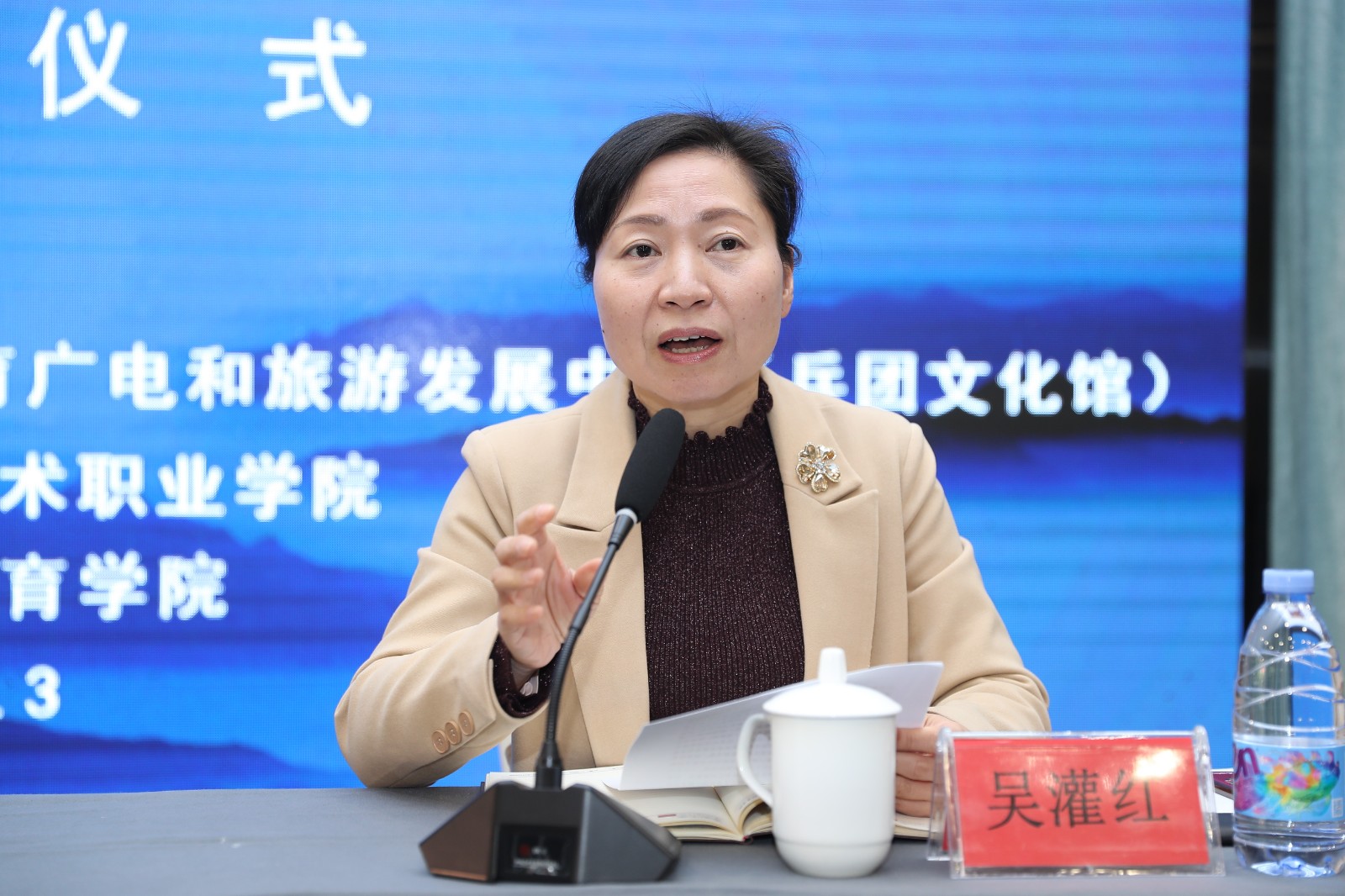 吴灌红代表学校对兵团文化系统的大力支持表示感谢,并热烈欢迎远道而来的新疆学员们。着眼国家层面“文化润疆”工程,她介绍了浙疆两地长期以来文化交流合作、互促互进的良好局面,并期待共同促进两地公共文化服务事业进一步发展。她从学校承担“春雨工程”等文化项目出发,向在座学员分享了学校与新疆共建、培训、演出中建立的深厚情缘,并介绍了我校正在阿克苏职业技术学院进行的“我爱浙疆之英才浙疆”浙阿艺术院校合作共建项目。