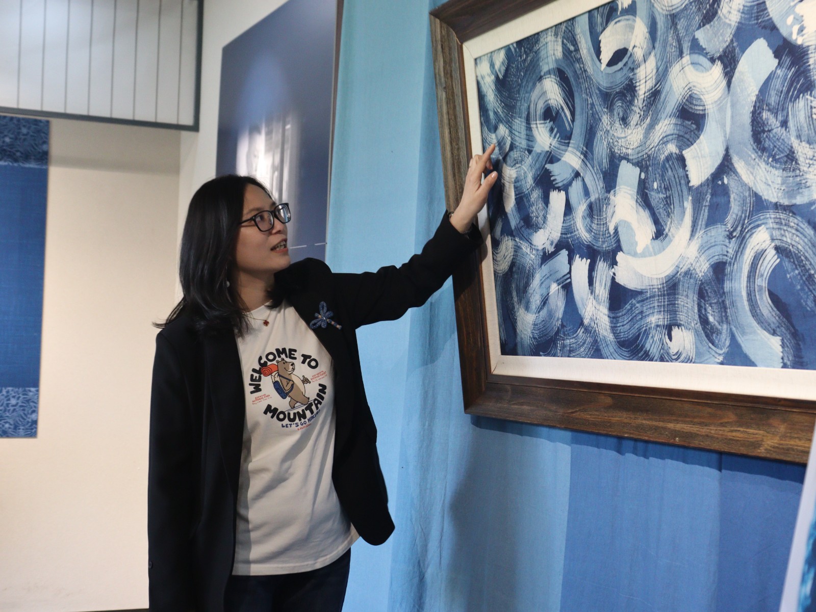 活动伊始,在手工艺学院民族传统技艺专业教研室主任胡锦霞老师的讲解下,校友们参观了“艺海撷英”浙江艺术职业学院手工艺邀请展——《观照·青蓝——‘丰’雅桐乡》蓝印花布作品展。通过通俗易懂的讲解,校友们从中国工艺美术大师、浙江省非遗传承人、浙江艺术职业学院特聘教授、丰同裕掌门人哀警卫的作品中,领略一块布料的艺术,了解染色过程,沉醉于蓝染技艺的神奇。不少校友讨论印染技艺和拍照留念,对手工艺品表现出了极大的兴趣。