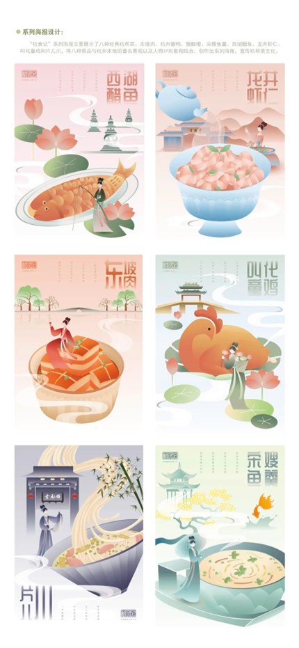 设计说明:该设计以“杭帮菜”为主题,旨在让更多人了解“杭帮菜”的特色与历史,宣传杭州的饮食文化。“杭帮菜”起源于距今一千多年的宋朝,我们将宋韵文化融入到视觉图形插画中,从多方面、多层次诠释“杭帮菜”的定义。以八种经典杭帮菜为主体,将杭州著名景点及建筑融入到花草树木、水泽山川中,再辅以“宋代女子”为蓝本设计的IP人物形象,以视觉鲜明的菜品、淡雅脱俗的景观、精巧动态的人物形象三者合一,创作出全方位宣扬“杭帮菜”与杭州饮食文化的作品。