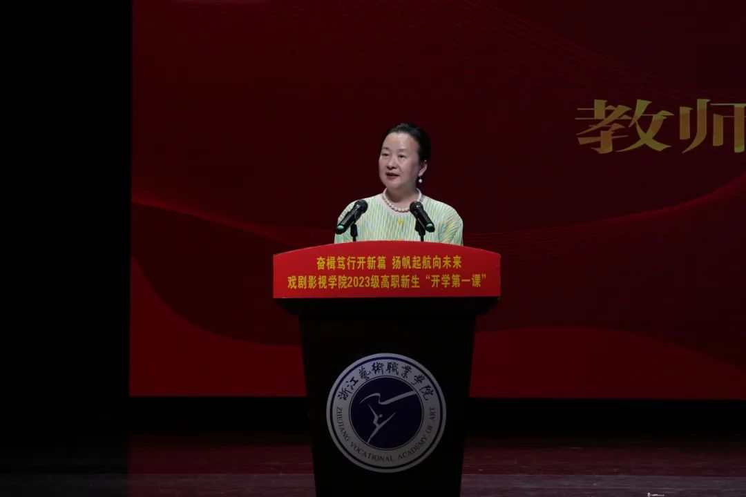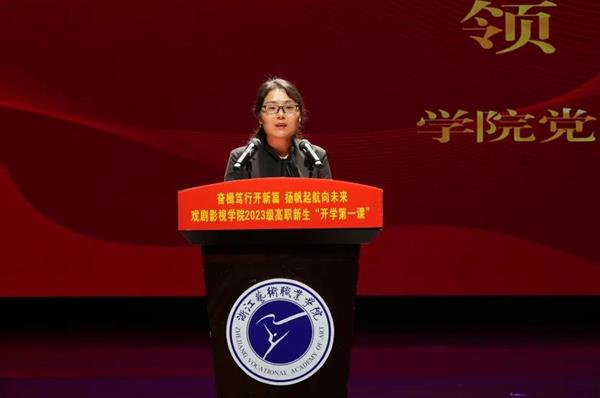 许瑛向全体新生的到来表示热烈的欢迎,并介绍了戏剧影视学院的基本情况。她向新生们提出三点希望:一是志存高远,厚植家国之情;二是自强不息,勇攀高峰之行;三是明理尚进,常存感恩之心。她期望同学们能让韶华在“求真尚美”中积淀,让梦想在“精艺修为”中升华,成长为具备健全人格、宽厚基础、创新思维和社会责任感的浙艺戏影人。