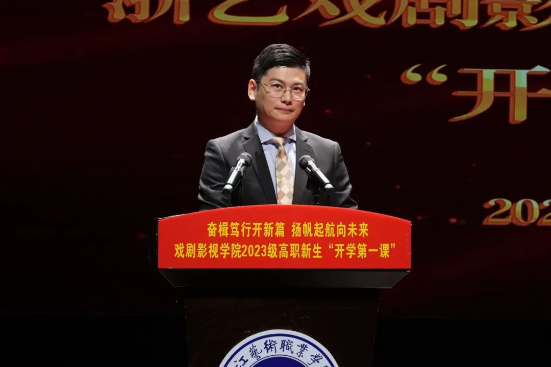10月13日晚,戏剧影视学院在浙江艺术实验剧场举行2023级高职新生“开学第一课”。戏剧影视学院院长那刚、党总支书记许瑛、副院长徐旭恒出席,校友代表、各专业教研室主任、行政教辅老师、新生班班主任和全体2023级新生参加。活动由徐旭恒主持。