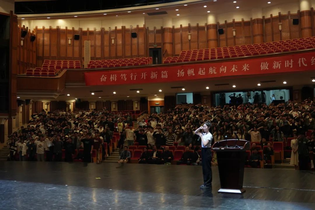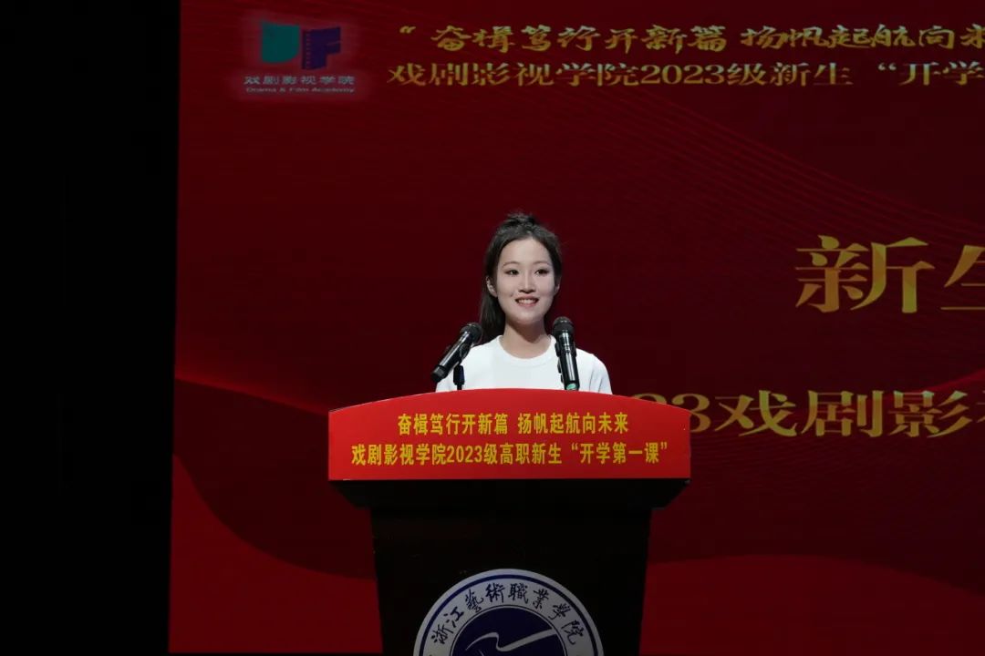 2023级戏剧影视表演1班学生沈蒋蕊作为新生代表发言。她表达了对学院的憧憬与求学途中克服困阻的努力,勉励同学们目标明确,笃行致远;珍惜时间,精进不休;修身立德,不忘初心,在大学时光中矢志践行当初的梦想,不畏风雨,让奋斗成为青春最亮眼的底色。