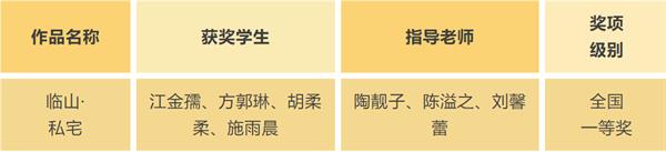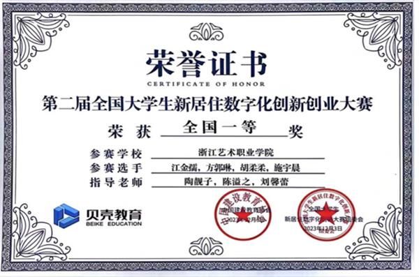 为提高学生运用知识解决实际问题的能力,积极鼓励学生参加各类专业竞赛,培养具有创新精神和实践能力的高素质技术技能人才,近日,由我院陶靓子、陈溢之和刘馨蕾老师指导,学生江金孺、方郭琳、胡柔柔、施雨晨所创作的作品《临山·私宅》在“贝壳杯”第二届全国大学生新居住数字化创新创业大赛——中国高校设计学科师生优秀作品展”中经过校内选拔、浙江赛区选拔,最终斩获全国一等奖。